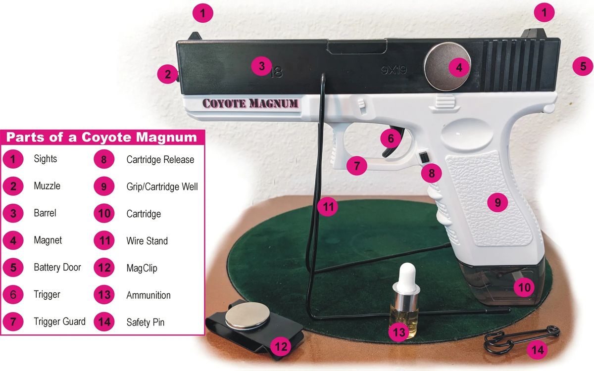 Clarified hot pepper extract. Ghost peppers, to be exact. No sediment or vinegar to muck up the CoyMag's internals. 4 or 5 drops mixed with water, and a couple squirts will turn a coyote right around. It's also safe for plants, so squirt your pots to keep those little critters away. Won't hurt to squirt some in your next chili, too. (Well, it might hurt a bit. Go easy).